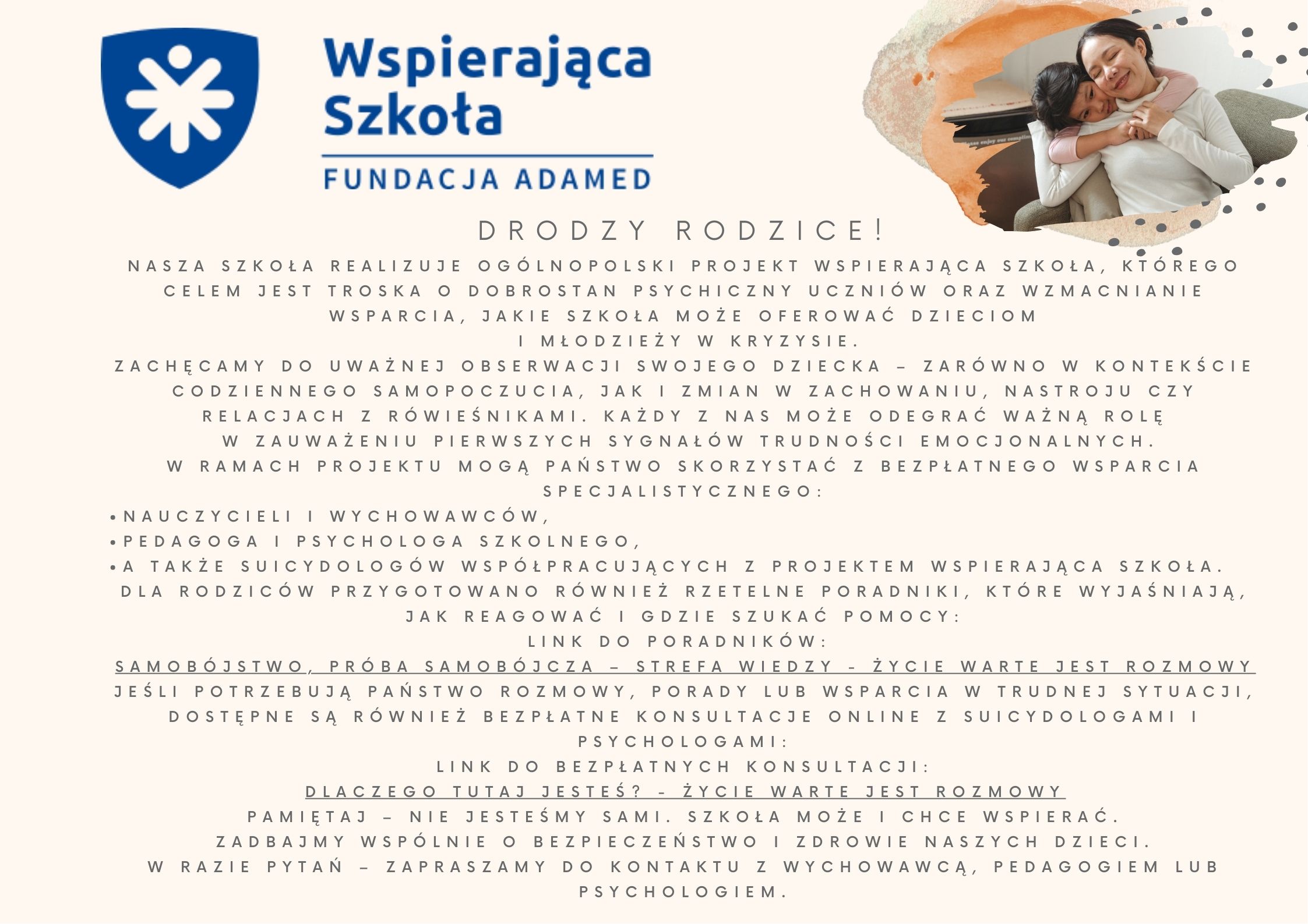 Drodzy Rodzice! Nasza szkoła realizuje ogólnopolski projekt Wspierająca Szkoła, którego celem jest troska o dobrostan psychiczny […]